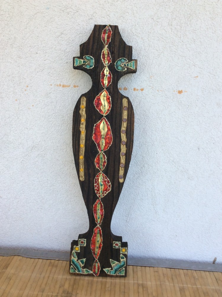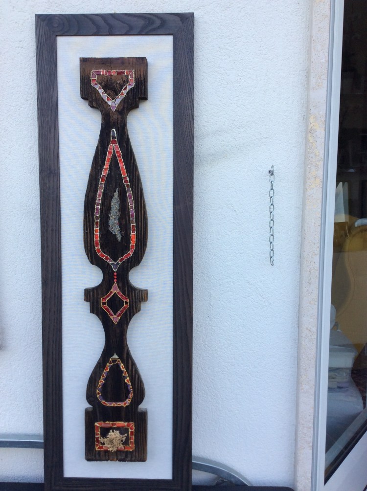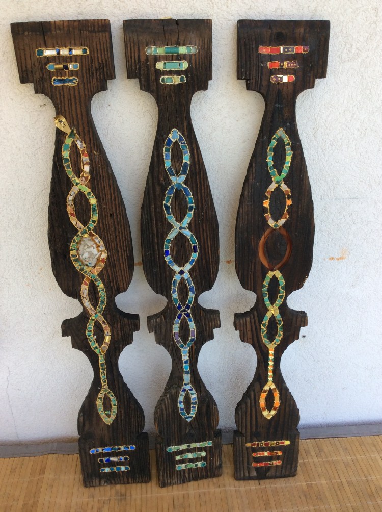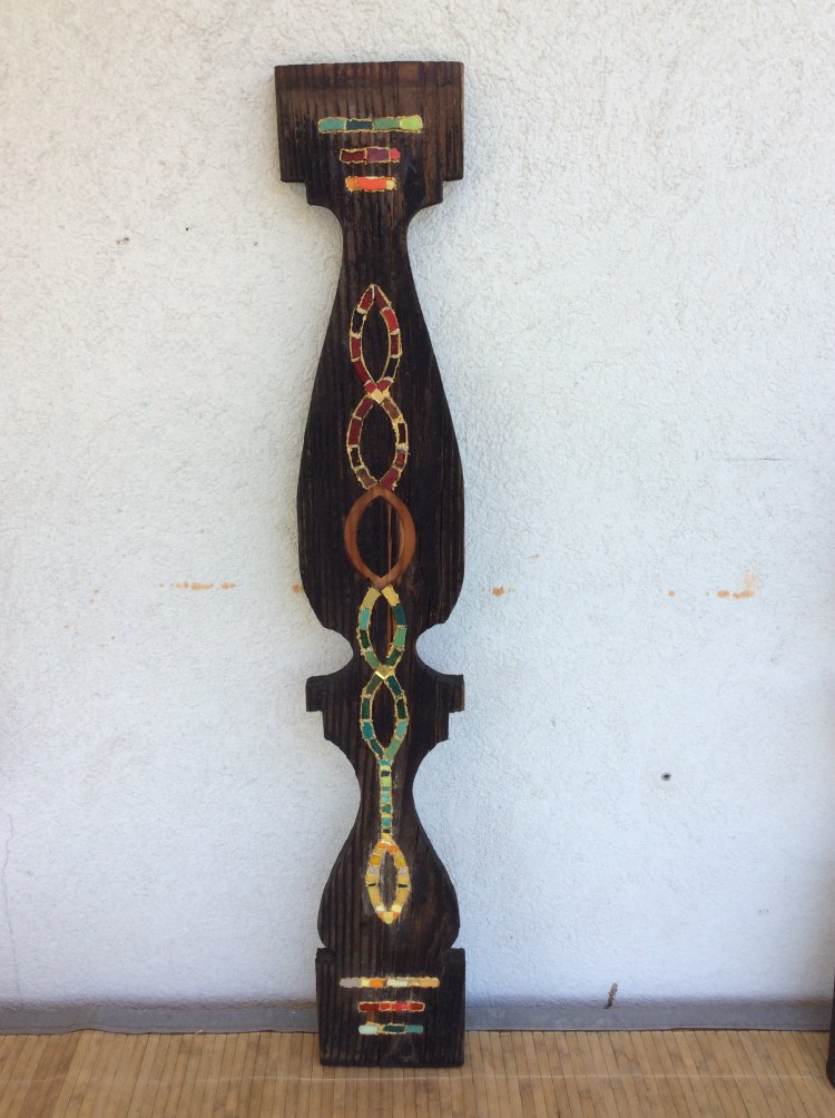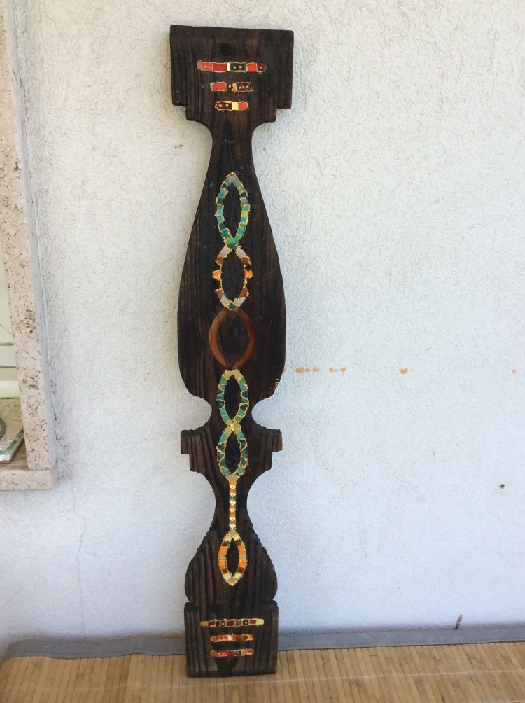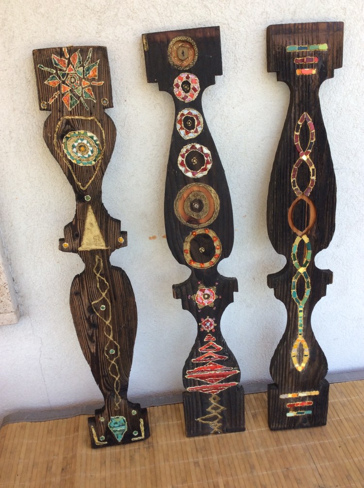 An old wooden terrace was demolished for renovation and I recovered the old panels. I was fascinated by touching the wood that was grayed out and worn by the weather: rain, sun, wind and snow.These panels, similar to totems, come from a village that was a war front and they are more than a hundred years old and have seen soldiers, religious processions, schoolchildren and tourists pass under them: they were destined for firewood and, arrived by chance in my hands, they underwent this unexpected transformation